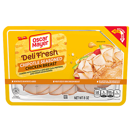 Skip the deli line and enjoy the sliced chicken breast you know, love and trust. Oscar Mayer Deli Fresh Chipotle Seasoned Chicken Breast delivers the flavorful slices you crave, coated with chipotle and red chili peppers, paprika and other seasonings. Chicken breast slices are fully cooked and ready to enjoy. Made with no artificial preservatives and no nitrites or nitrates added, each serving of chipotle seasoned chicken breast slices contains 9 grams of protein (see ingredient line for ingredients to support quality). Our Peel and Reseal feature ensures maximum freshness, thanks to our fully resealable lid that keeps every slice as delicious as the first. Whether you're stacking a sandwich, adding protein to your salad, crafting a charcuterie board or snacking straight from the fridge, you can count on the resealable packaging to lock in freshness after every use. Each 8-ounce pack of sliced chicken breast contains 4 servings. Keep it Oscar and enjoy deli-style chicken breast at home.